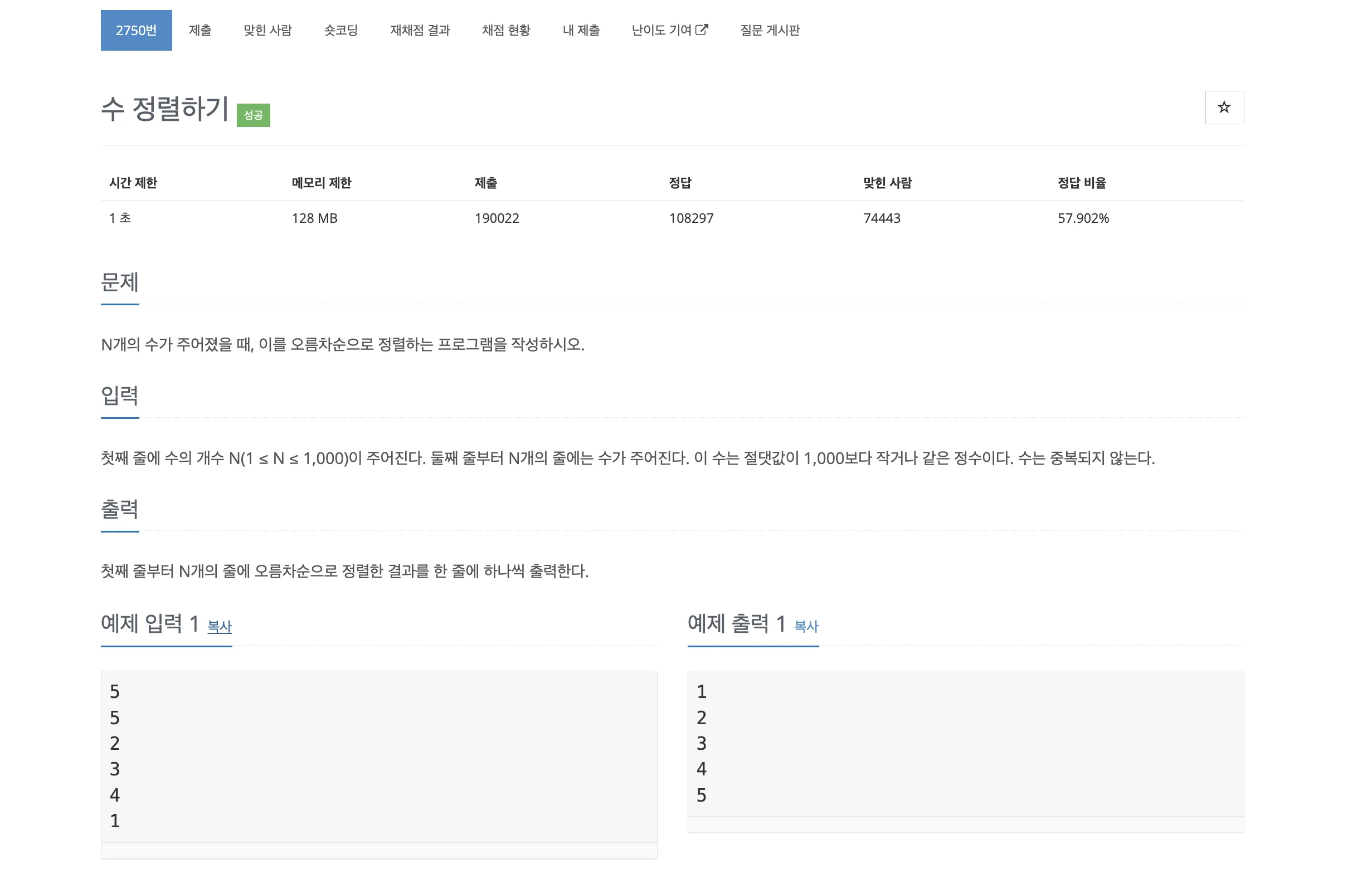 코드 테스트 - 백준 2750번: 수 정렬하기