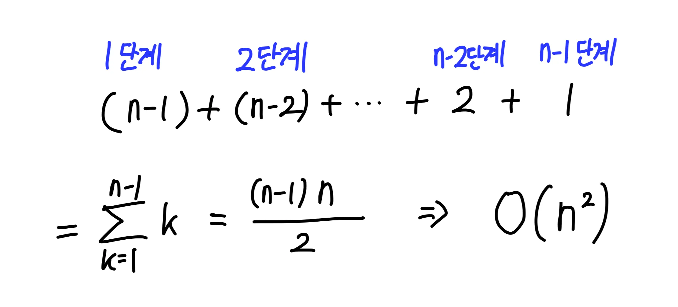 버블 정렬의 시간 복잡도는 best, worst, average case 모두 O(n^2) 이다.