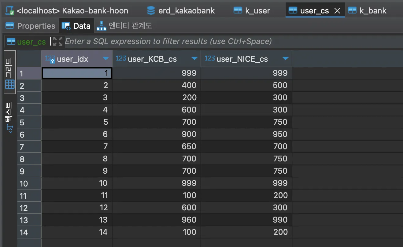 ❗ 유저 신용점수 테이블 생성
