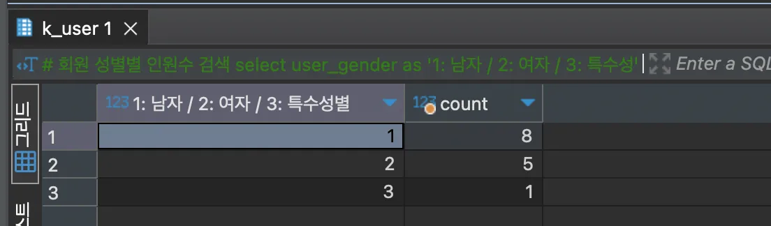 user_gender as '1: 남자 / 2: 여자 / 3: 특수성별',