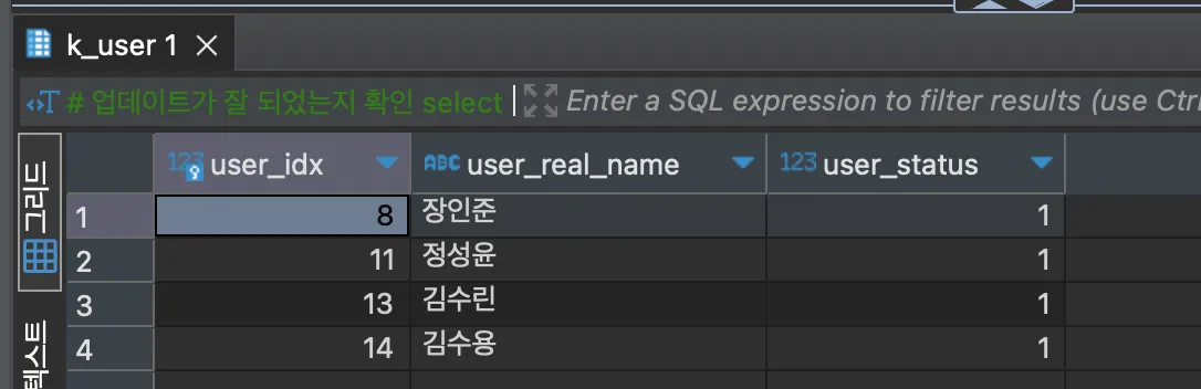 update k_user set user_status = 1 where user_idx in (8, 11, 13, 14) and user_status =3;